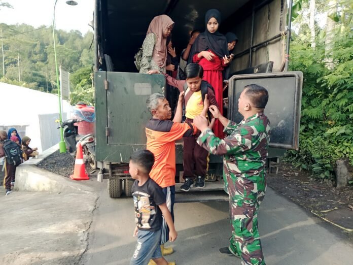 Lumajang – Dalam upaya memastikan kegiatan belajar mengajar tetap berjalan pasca erupsi Semeru, Sertu Biardi, anggota Kodim 0821 Lumajang, membantu mengantar anak-anak dari lokasi pengungsian menuju SDN 02 Supiturang. Rabu(26/11/2025)