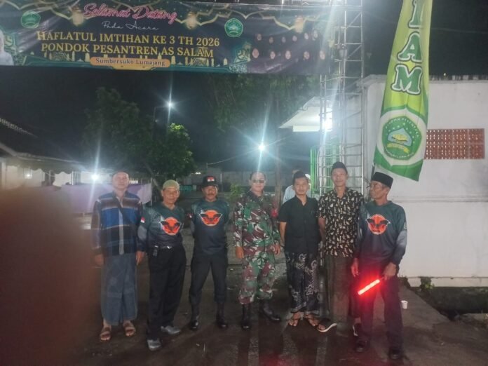Lumajang – Sinergitas TNI, Polri, dan unsur keamanan desa kembali terlihat dalam pengamanan kegiatan keagamaan di wilayah Kecamatan Sumbersuko. Babinsa Sumbersuko Koramil 0821-19/Sumbersuko Sertu Warsono bersama Bhabinkamtibmas serta Satuan Keamanan Desa (SKD) melaksanakan pengamanan Haflatul Imtihan Pondok Pesantren As-Salam yang berlokasi di Desa Sumbersuko, Kecamatan Sumbersuko, Kabupaten Lumajang, Jawa Timur, pada Sabtu malam (7/2/2028).
