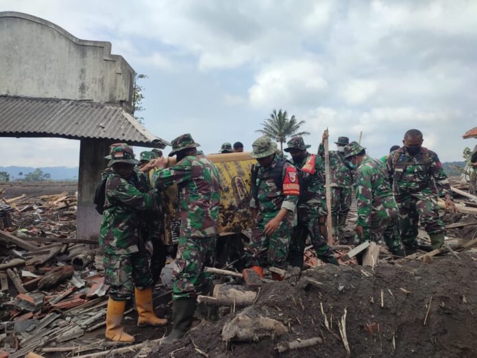 Dalam kegiatan tersebut, anggota bersama masyarakat bergotong-royong menggali dan mengeluarkan kulkas milik warga yang tertimbun material vulkanik akibat erupsi. Tindakan cepat dan terkoordinasi ini merupakan wujud kepedulian TNI dalam membantu pemulihan kondisi lingkungan pascabencana.