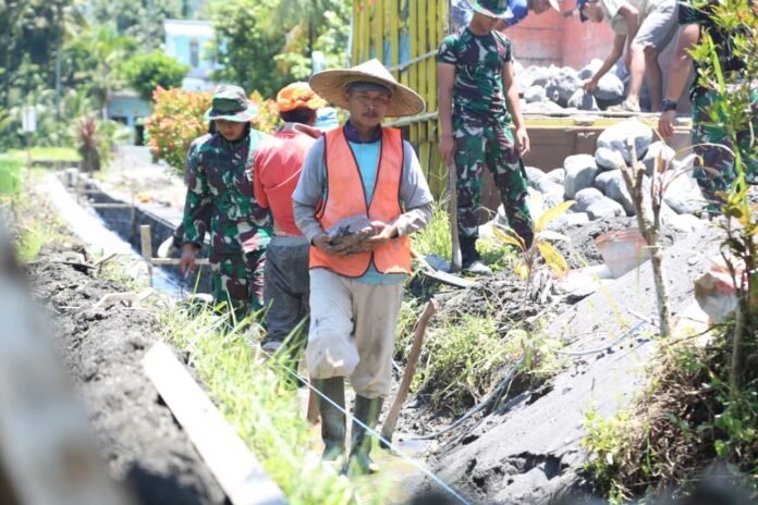 Di bawah teriknya matahari, para prajurit dan warga tampak bekerja penuh semangat. Tanpa sekat dan tanpa mengenal lelah, mereka saling membantu memindahkan batu material ke lokasi pengerjaan. Pemandangan tersebut menjadi bukti kuat bahwa kemanunggalan TNI dan rakyat bukan sekadar slogan, melainkan wujud nyata semangat gotong royong yang hidup di tengah masyarakat pedesaan.