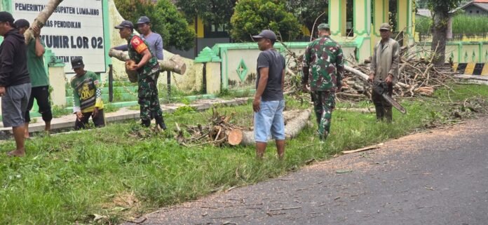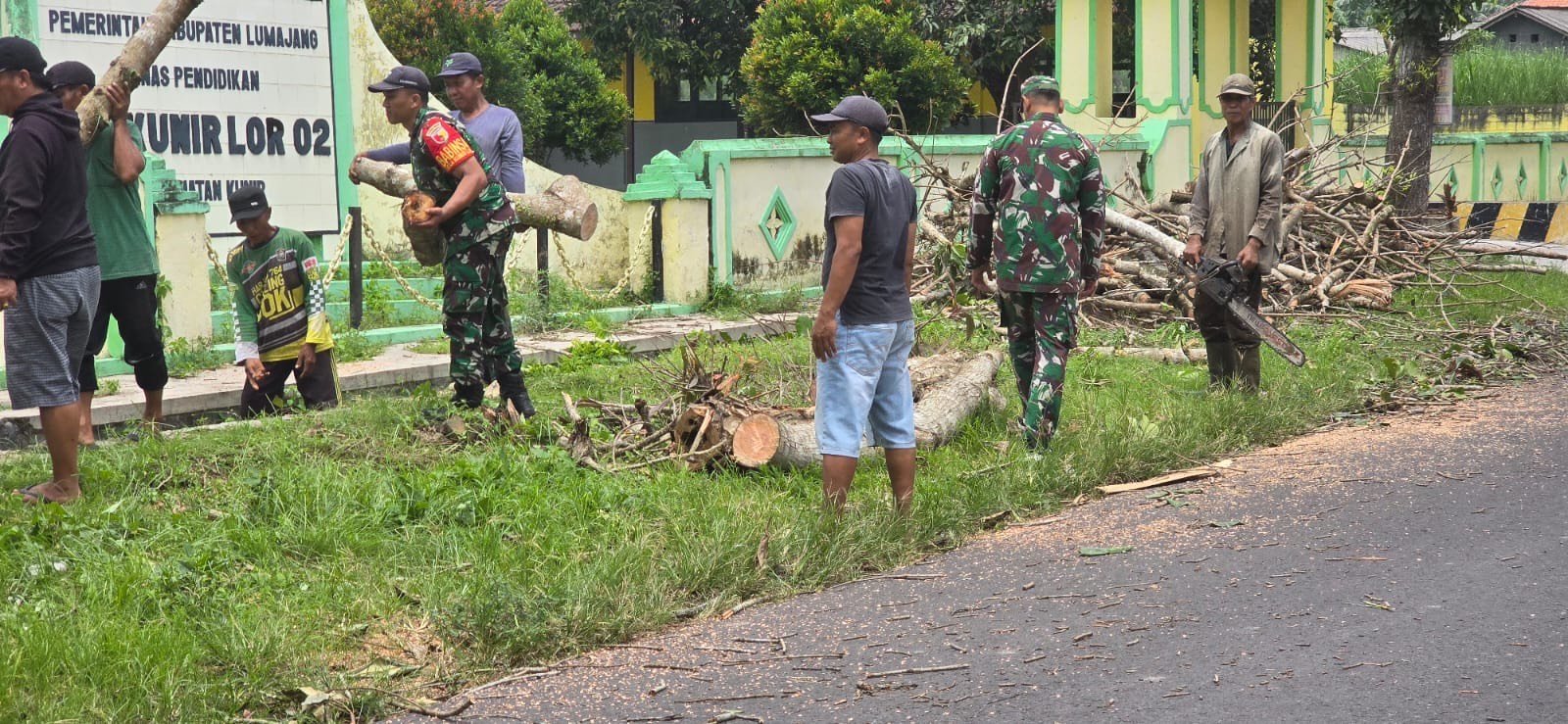 Lumajang – Wujud nyata kepedulian terhadap keselamatan dan kenyamanan masyarakat kembali ditunjukkan Babinsa Kunir Lor Koramil 0821-13/Kunir, Sertu Harianto Dwi Cahyono. Bersama dua personel Koramil dan warga setempat, Babinsa melaksanakan kegiatan kerja bakti penebangan pohon yang sudah rapuh dan berpotensi membahayakan pengguna jalan, bertempat di Dusun Sumbersari RW 002 RT 002 Desa Kunir Lor, Kecamatan Kunir, Kabupaten Lumajang, Jawa Timur, Senin (26/1/2026).