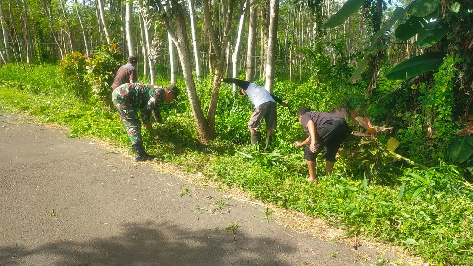 Kegiatan tersebut difokuskan pada pembersihan rumput liar dan sampah yang berada di sepanjang sisi jalan dusun. Dengan penuh semangat kebersamaan, Babinsa dan warga bahu-membahu menggunakan peralatan sederhana seperti cangkul, sabit, dan sapu untuk menciptakan lingkungan yang bersih, rapi, dan nyaman dilalui masyarakat.