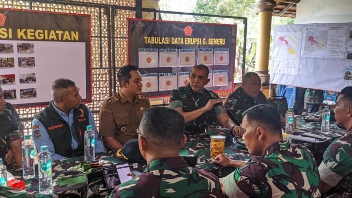 Lumajang, Komitmen TNI dalam hadir untuk rakyat kembali tampak saat Pangdam V/Brawijaya, Mayjen TNI Rudi Saladin, turun langsung meninjau kondisi terkini wilayah terdampak erupsi Gunung Semeru. Didampingi Danrem 083/Baladhika Jaya Kolonel Inf Kohir serta jajaran Forkopimda Lumajang, Pangdam meninjau Posko Tanggap Darurat Bencana di Desa Supiturang, Kecamatan Pronojiwo, Kabupaten Lumajang, Jawa Timur. pada Senin (24/11/2025).