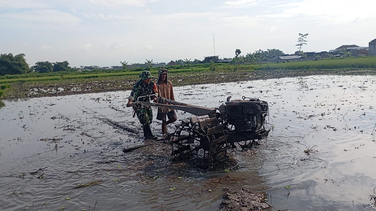 Lumajang, Dalam upaya mendukung program ketahanan pangan dan meningkatkan produktivitas pertanian, Babinsa Jogoyudan Koramil 0821-01/Lumajang, Serda M. Mu’ali, melaksanakan pendampingan pengolahan lahan sawah Kelompok Tani (Poktan) Tunas Makmur Kelurahan Jogoyudan, Kecamatan Lumajang, Kabupaten Lumajang, Jawa Timur, pada Jumat (20/2/2026).