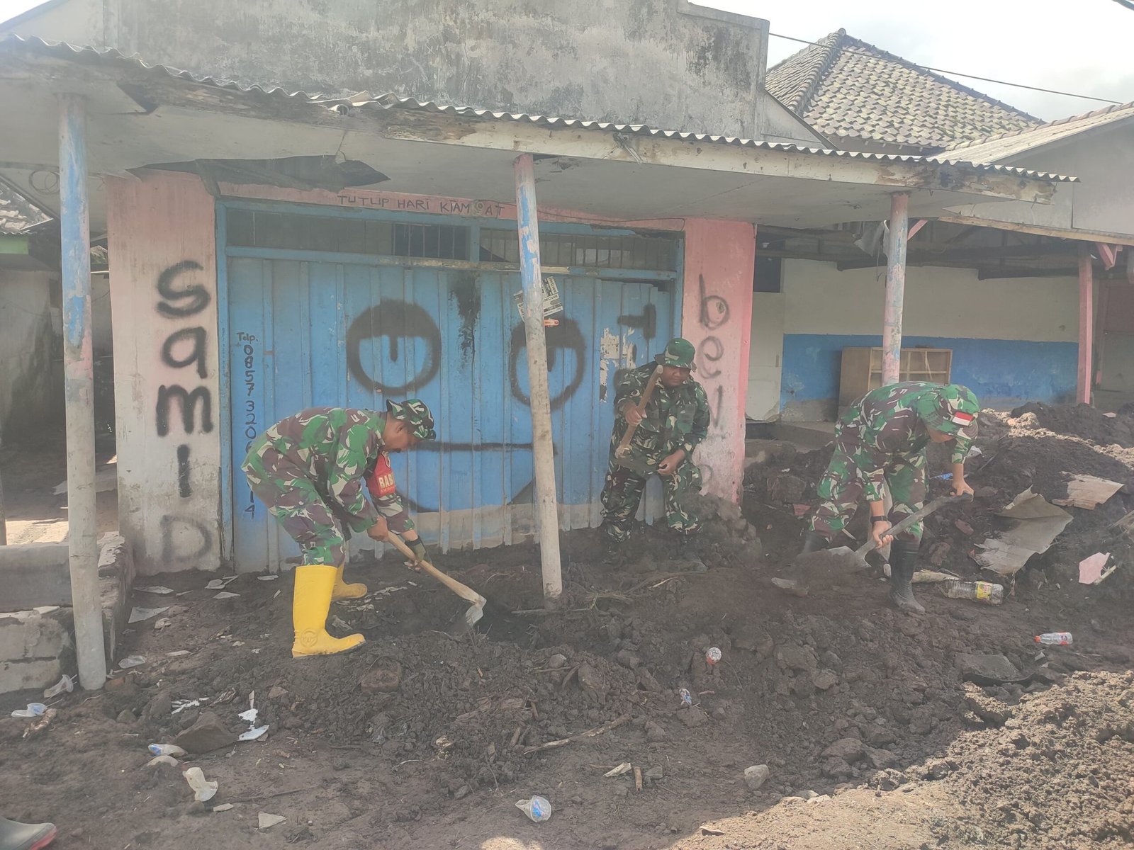 Sejak pagi, Serda Heru dan tim lainya bergerak menyisir rumah warga yang masih dipenuhi pasir, material keras, serta lumpur sisa lahar dingin. Dengan menggunakan cangkul, sekop, dan peralatan manual lainnya, para personel bekerja cepat mengeluarkan material yang masuk hingga ke dalam ruangan rumah.