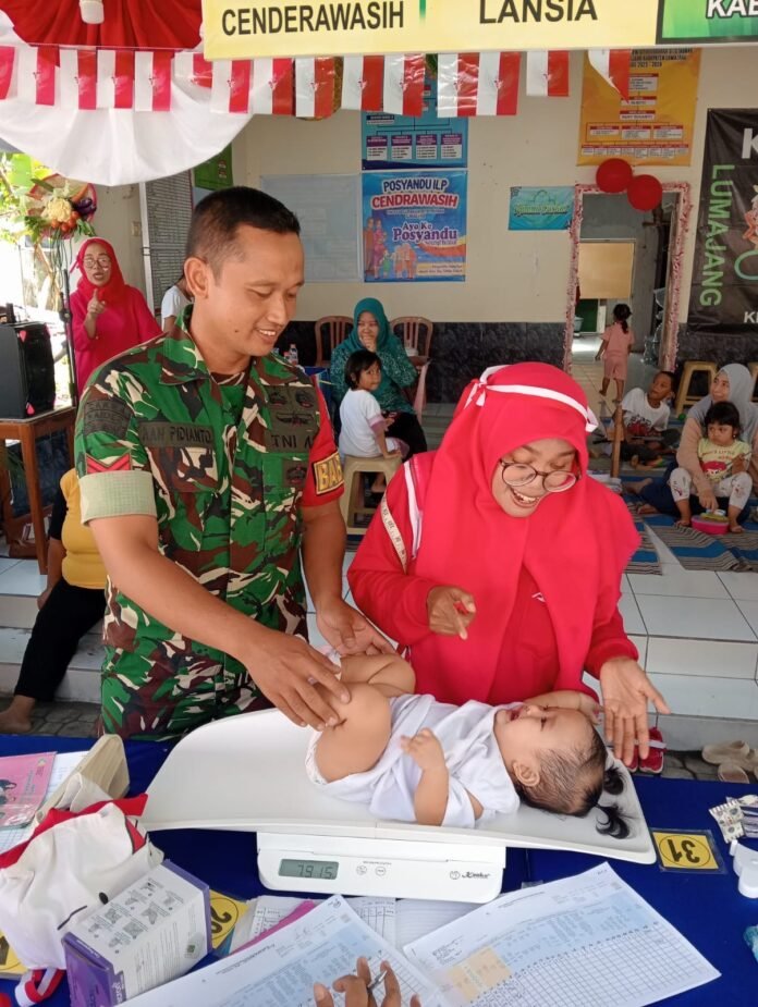 Lumajang – Wujud nyata kepedulian TNI terhadap peningkatan kualitas kesehatan masyarakat, Babinsa Ditotrunan Koramil 0821-01/Lumajang, Koptu Aan Pidianto. Ia melaksanakan pendampingan pelayanan kesehatan di Posyandu Sekarsari RT 004 RW 006, Kelurahan Ditotrunan, Kecamatan Lumajang, Kabupaten Lumajang, Jawa Timur, pada Jumat (9/1/2026).
