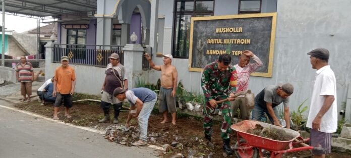 Lumajang – Wujud nyata kemanunggalan TNI dengan rakyat kembali ditunjukkan Babinsa Kandangtepus Koramil 0821-03/Gucialit, Serda Handrian Aji Siagwan, yang turut membantu warga melaksanakan kegiatan kerja bakti pembersihan dan pengecoran sisi jalan di Musala Baitul Muttaqin, Dusun Wonorejo RT 002 RW 005, Desa Kandangtepus, Kecamatan Senduro, Kabupaten Lumajang, Jawa Timur, pada Rabu (11/2/2026).