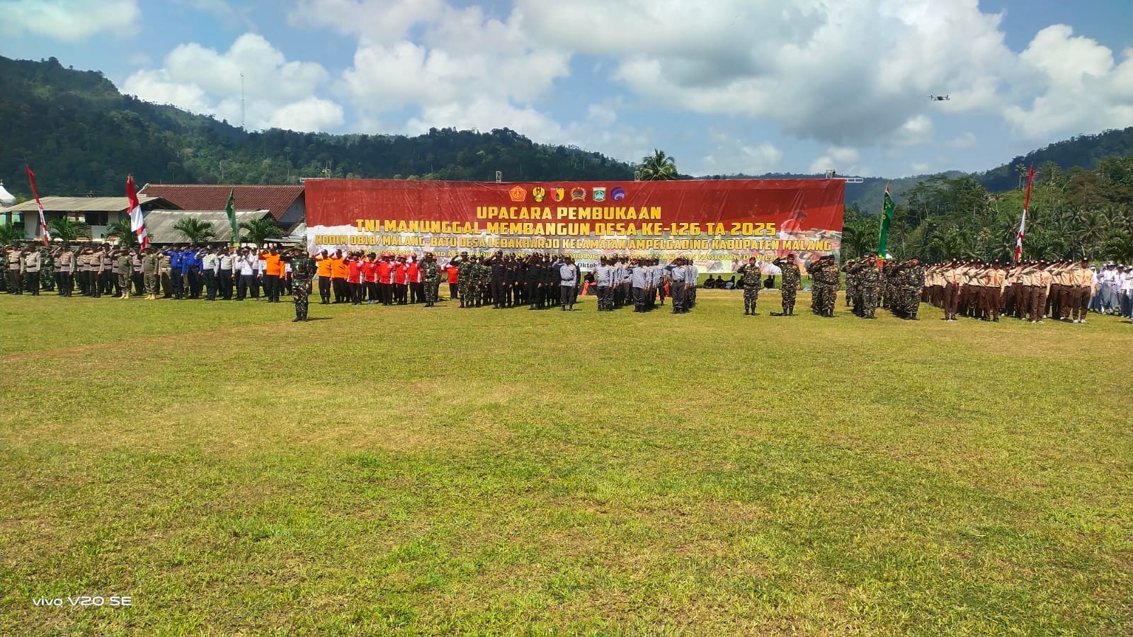 Malang, TMMD 126 – Terik matahari yang menyengat tak menyurutkan semangat para peserta upacara dalam pembukaan TNI Manunggal Membangun Desa (TMMD) ke-126 Tahun Anggaran 2025, yang digelar di Lapangan Sepak Bola Desa Lebakharjo, Kecamatan Ampelgading, Kabupaten Malang, Jawa Timur, Rabu (8/10/2025).