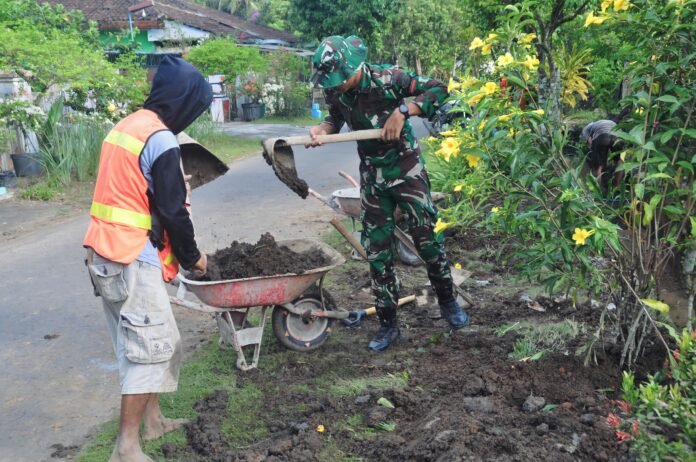 Malang, TMMD ke 126  – Kekompakan antara personel Satgas TNI Manunggal Membangun Desa (TMMD) ke-126 Kodim 0818/Malang dengan masyarakat tampak jelas dalam pengerjaan pembangunan drainase di Dusun Krajan 1B, Desa Lebakharjo, Kecamatan Ampelgading, Kabupaten Malang, Senin (13/10/2025).