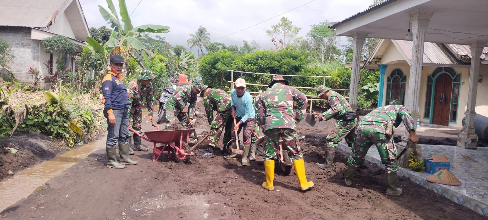 “Kami bersama Polri, relawan, dan warga turun langsung untuk membersihkan material lumpur. Harapannya, rumah-rumah warga bisa segera digunakan kembali dan aktivitas masyarakat dapat normal secepatnya,” ujar Letda Inf Sugiyono.