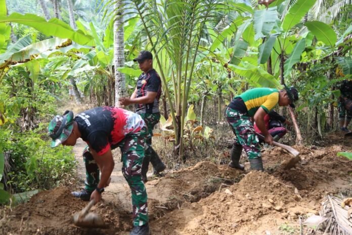 Terlihat di lapangan, para prajurit bekerja penuh semangat, menggali dan merapikan tanah di area yang dikelilingi perkebunan warga. Aktivitas tersebut menggambarkan harmoni antara kekuatan fisik dan ketulusan hati dalam mengabdi untuk negeri.