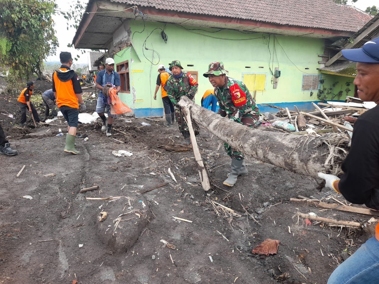 Danramil 0821/14 Pronojiwo, Letda Inf Sugiono, menyampaikan bahwa pembersihan dilakukan secara menyeluruh dan diprioritaskan pada rumah-rumah dengan akumulasi material terberat. TNI bersama Polri, perangkat desa, relawan, dan masyarakat melakukan kerja bakti terpadu dengan memanfaatkan alat manual dan bantuan semprotan air untuk mempercepat proses pembersihan.